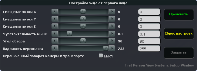 Смещение по оси X - сдвиг по горизонтали Смещение по оси Y - приближение Смещение по оси Z - сдвиг по вертикале Чувствительность мышки - скорость вращение камеры. Угол обзора - угол обзора, работает совместимо с Смещение по оси Y. Видимость персонажа - указываете насколько виден ваш персонаж вам самим. (Остальные игроки видят его полностью) Ограниченный поворот камеры в транспорте - если галочка не стоит, то у вас \"пропадает\" шея и камеры вращается 360 градусов. Если же стоит галочка, то камера, от вашего положения, вращается на 180 градусов влево и право.